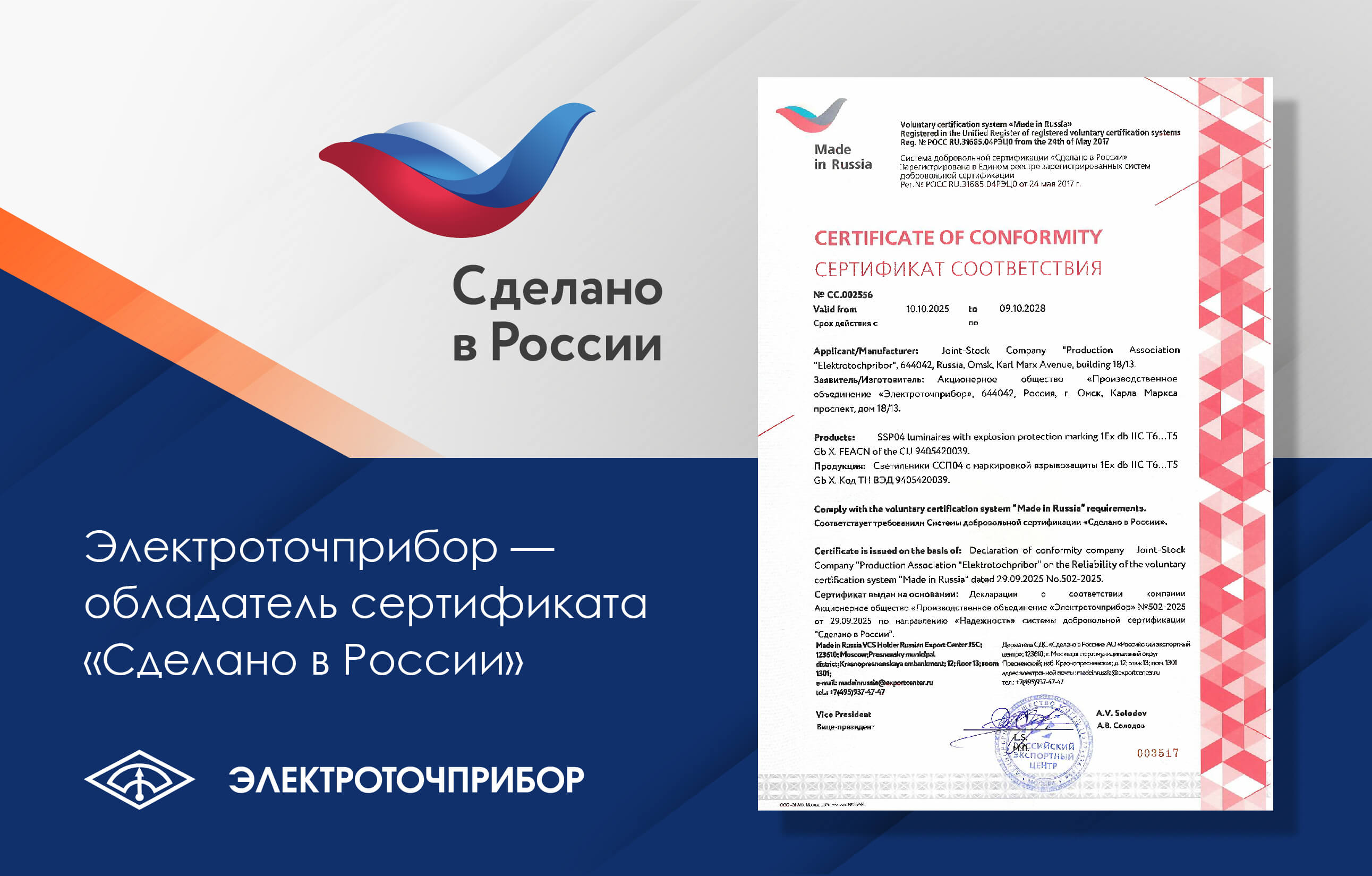 «Электроточприбор» получил сертификат «Сделано в России» - от производителя Электроточприбор. Разработка и производство взрывозащищенных светодиодных светильников, щитовых, переносных и стационарных электроизмерительных приборов.